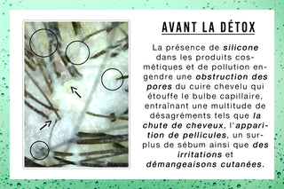 La détox permet également de désengorger le cheveu de toutes les substances nocives dues aux produits cosmétiques (silicone) qui partent difficilement au lavage et qui obstruent les pores du cuir chevelu et donc, la (re)pousse de celui-ci.