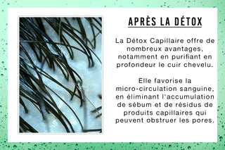 La Détox capillaire permet d'assainir en profondeur le cuir chevelu en régulant l'excès de sébum, ce qui favorise une meilleure oxygénation de celui-ci.